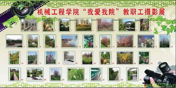 2015年5月至6月,由机械工程学院分工会组织的教职工摄影展在教学楼大厅布展,共展出教职工摄影作品31幅。此次摄影比赛得到了教职工们的大力支持,历经一个月的收集和评定,最终选出优秀作品28幅,一、二、三等奖各一名。这些作品都是机械工程学院教职工利用业余时间拍摄的,充分体现了他们对生活的热爱,对校园美丽风情的眷恋。