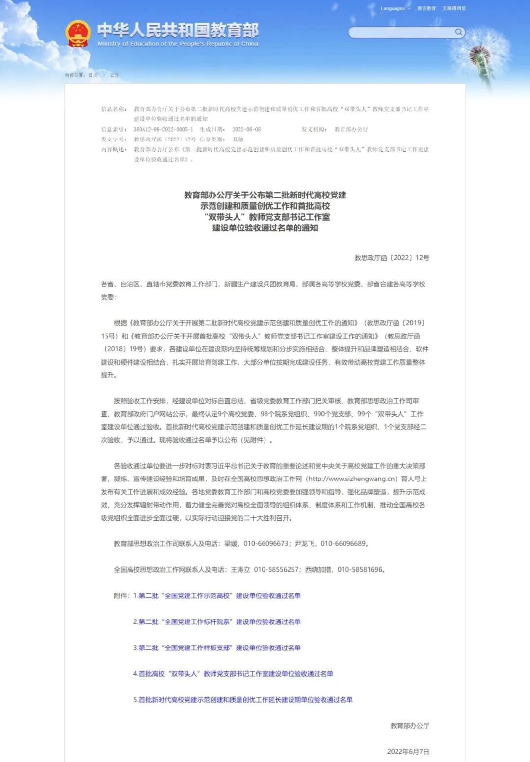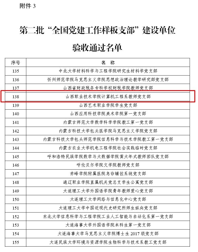 6月27日,教育部官网公布了《教育部办公厅关于公布第二批新时代高校党建示范创建和质量创优工作和首批高校“双带头人”教师党支部书记工作室建设单位验收通过名单的通知》(教思政厅函〔2022〕12号),山西省共有17所高校基层党支部(本科14所,高职高专3所)顺利通过教育部第二批“全国党建工作样板支部”培育创建验收。