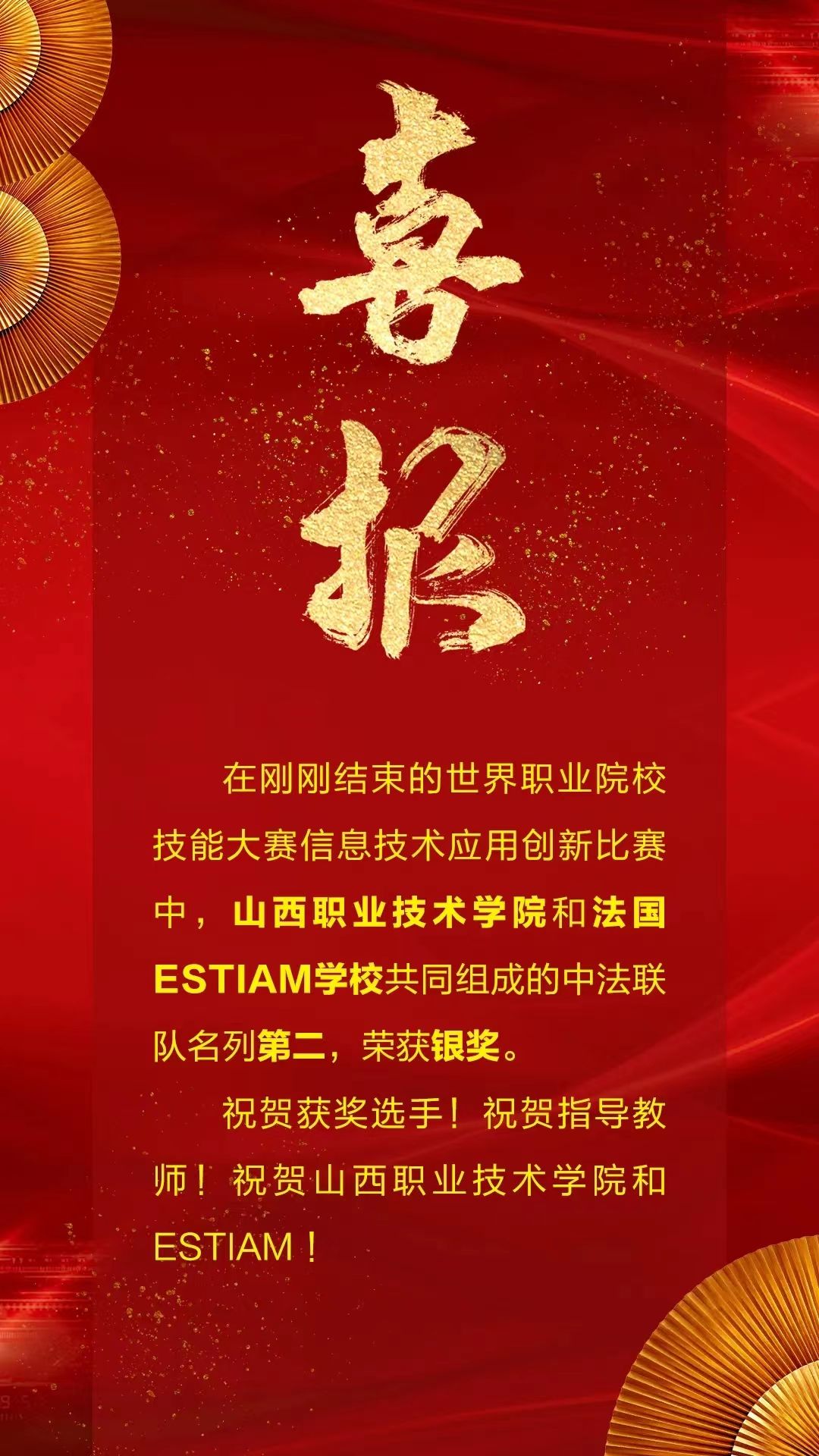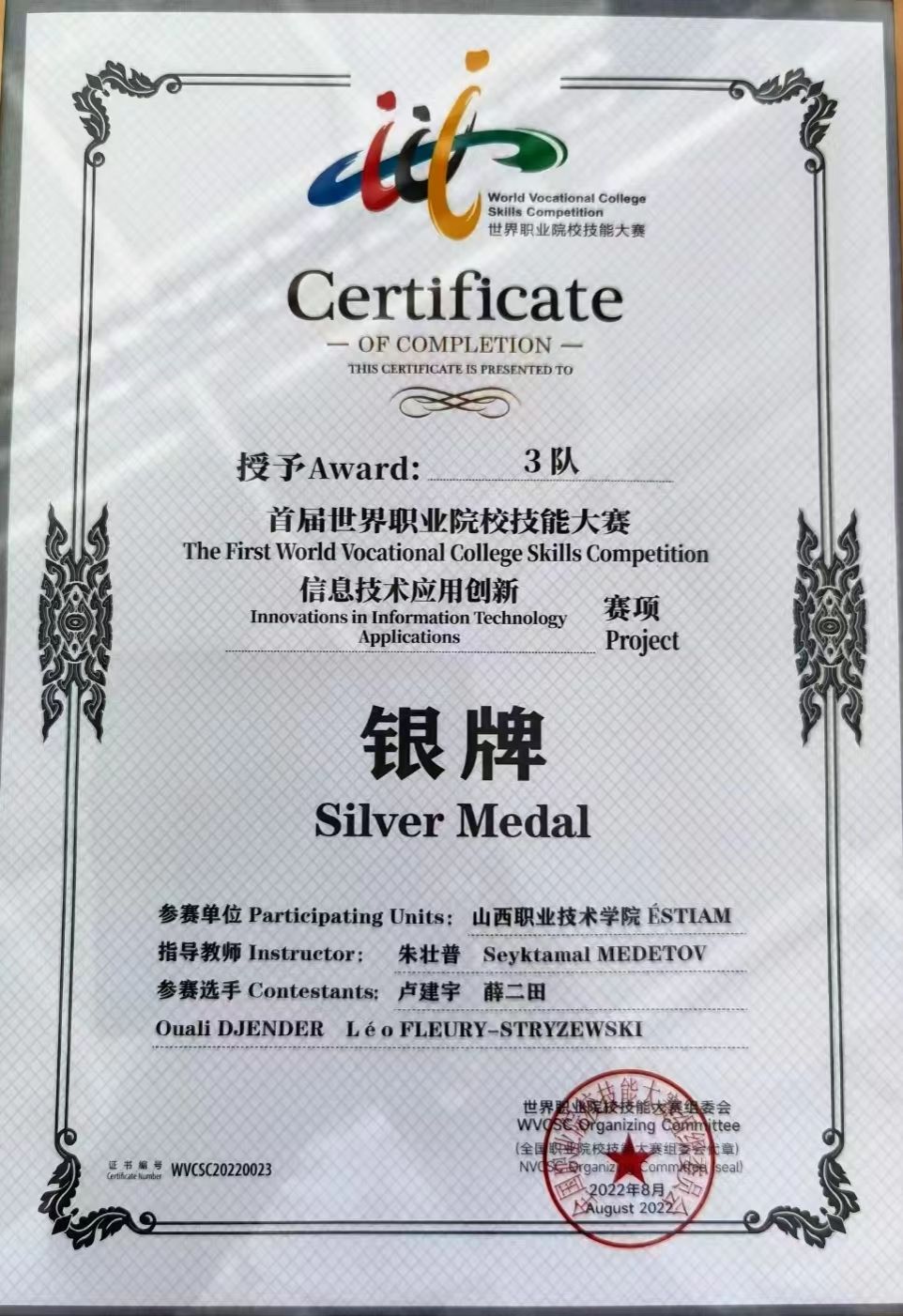 在刚刚结束的2022年首届世界职业院校技能大赛信息技术应用创新赛项中,万象城官网和法国Estiam学校共同组成的中法联队名列第二,荣获银牌。祝贺获奖选手!祝贺指导老师!