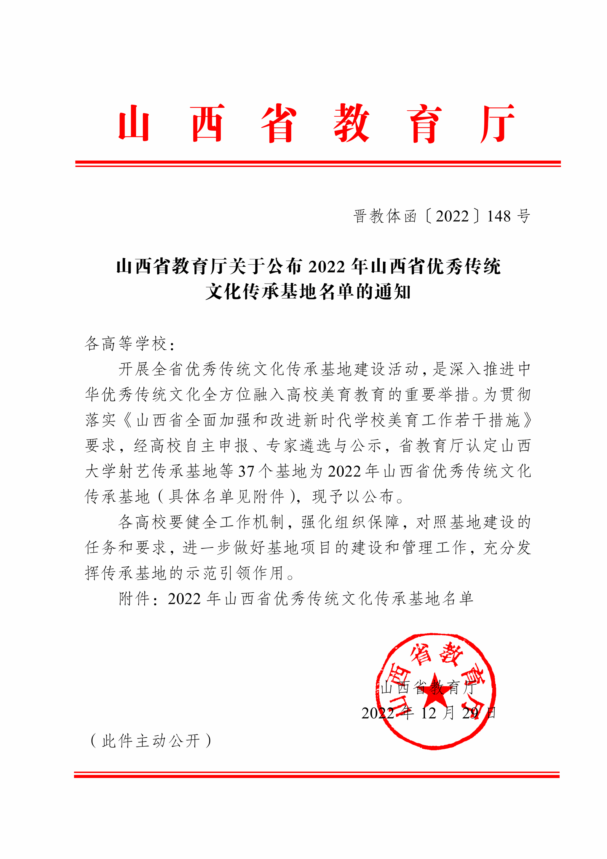近日,山西省教育厅发布《山西省教育厅关于公布2022年山西省优秀传统文化传承基地名单的通知》(晋教体函〔2022〕148号)文件通知,经全省各高校自主申报、省教育厅组织专家遴选与公示,共认定37个山西省优秀传统文化传承基地,万象城官网“形意拳”项目成功获批。