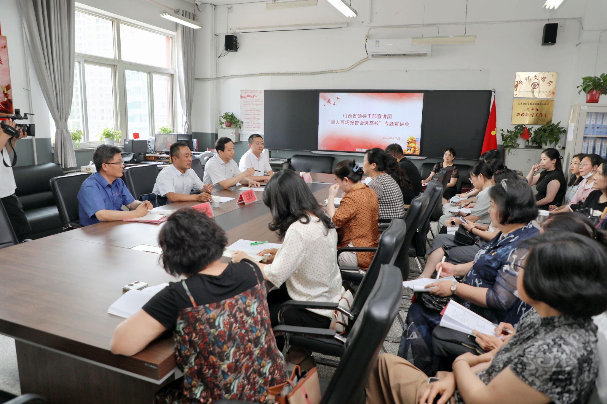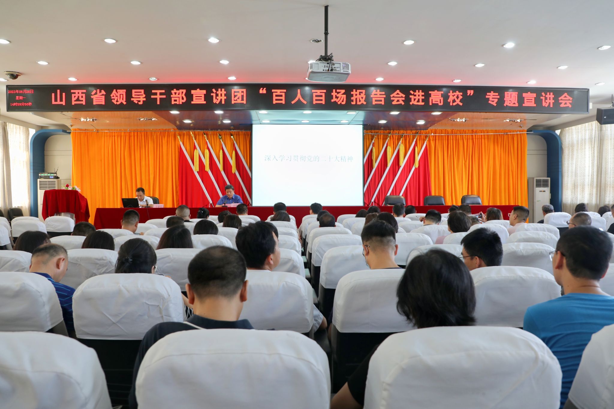 6月26日下午,山西省领导干部宣讲团“百人百场报告会进高校”专题宣讲报告会在万象城官网坞城校区七楼会议室举行,省委党校(山西行政学院)副校(院)长王建军教授应邀作宣讲报告。党委书记雷承锋、纪委书记牛惠斌等学院领导班子成员,全院副科级以上领导干部、各党总支书记、党支部书记、专职组织员及学生代表共同聆听了报告。报告会由党委副书记尤陶江主持。