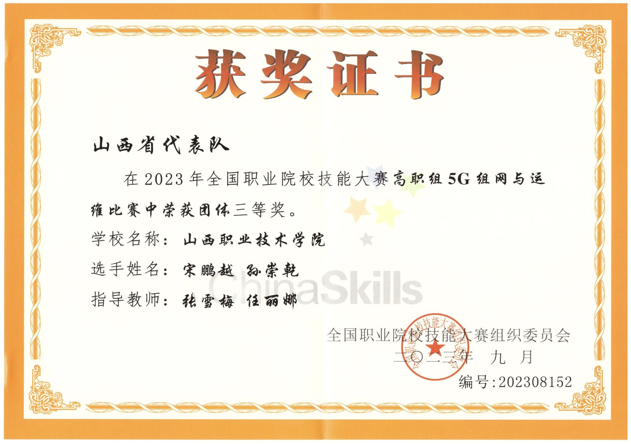 9月22日至9月25日,2023年全国职业院校技能大赛高职组“5G组网与运维”赛项在上海电子信息职业技术学院举行,指导教师张雪梅、任丽娜、江旭岗(数字技术产业学院)带领参赛选手宋鹏越、孙崇乾,在两天8小时中对5G公共网络进行规划部署与开通、运维与优化,5G专用网络组网与运维,与全国各地的60支队伍报名参赛展开激烈的角逐,荣获团体三等奖。
