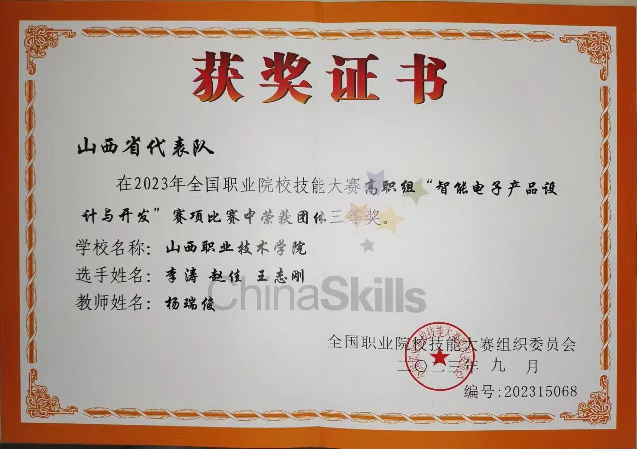 9月25日至28日,2023年全国职业院校技能大赛高职组“智能电子产品设计与开发”赛项在烟台职业学院举行,教师杨瑞俊与学生李涛、王志刚、赵佳4人组成参赛队,师生默契配合,在两天11小时中,应用计算机辅助设计软件进行器件选型、电路设计、仿真测试、PCB 设计;完成电子电路的设计与制作;使用微控制器开发平台、调试工具进行微控制器程序开发;完成智能产品软硬件设计、装调及其运维,与来自全国的59支参赛队伍同台竞技,荣获团体三等奖。本届国赛在赛项形式、时间和题型等方面进行了改变和创新,面对新赛制、新挑战,在教师队长的组织带领下,潜心研究、刻苦训练,充分发挥了积极进取的精神风貌和扎实的专业能力,表现出良好职业素养和竞技状态。