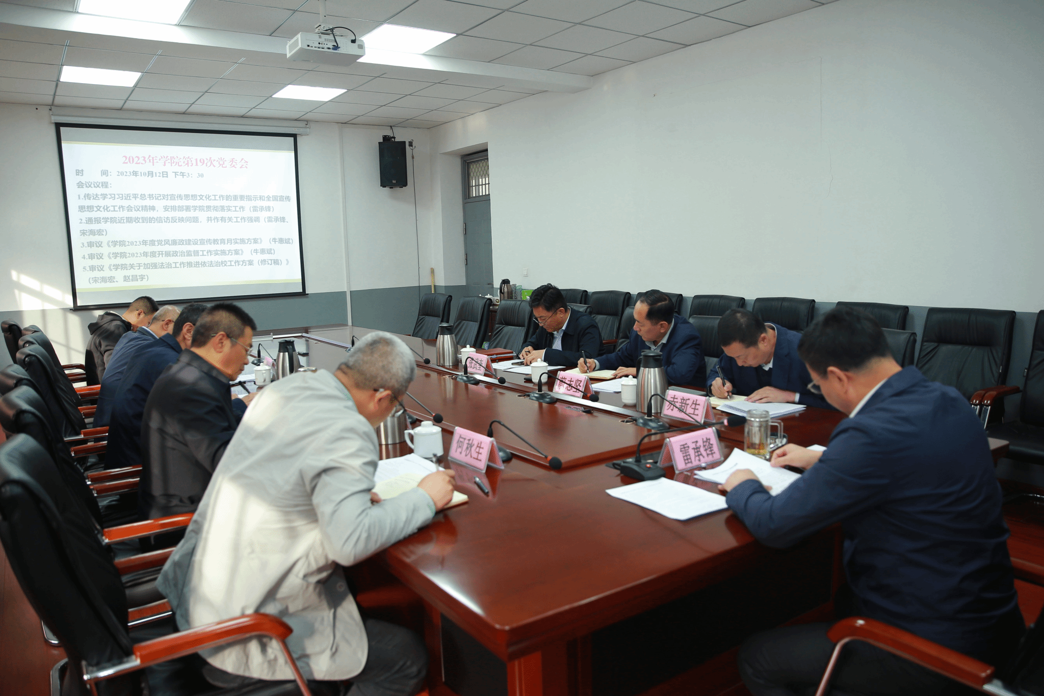 10月12日,学院党委书记雷承锋主持召开2023年第十九次党委会。会议传达学习习近平总书记对宣传思想文化工作的重要指示和全国宣传思想文化工作会议精神,安排部署贯彻落实工作。在校的党委委员参加会议,相关部门负责同志列席会议。