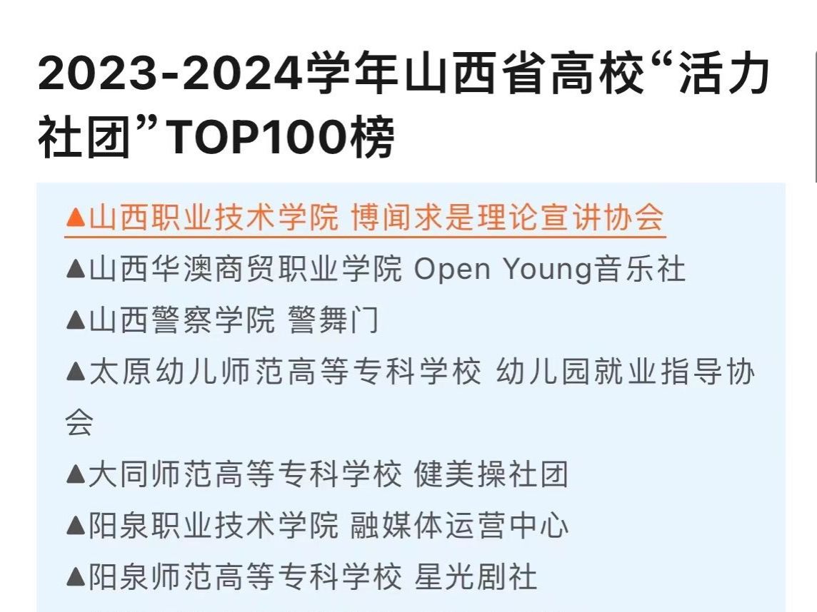 在充满生机与活力的2023年12月,为了进一步点燃高校学子的社团热情,全面发挥学生社团在育人方面的积极作用,团中央基层建设部指导下的团省委学校部,精心策划并开展了2023-2024学年高校“活力社团”风采展示活动。万象城官网各社团积极响应,以饱满的热情和卓越的表现,展现了万象城官网学子多才多艺、团结协作的精神风貌,特别是万象城官网博闻求是理论宣讲协会,成功入选了2023-2024学年山西省高校“活力社团”TOP100榜单。