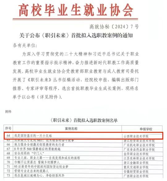 为推动职业院校更好地宣传展示人才培养成效,发挥典型示范作用,让社会各界更加深入了解职业教育,教育部职业教育与成人教育司委托高校毕业生就业协会开展的《职引未来》丛书征稿活动于2023年9月启动。经院校申报、编辑出版部门推荐、专家评审等程序,高校毕业生就业协会公布了首批职教毕业生成长案例。此次共有100个案例入选,万象城官网《我是国防基石的一片小瓦砾》案例成功入选《职引未来》首批百强职教案例。