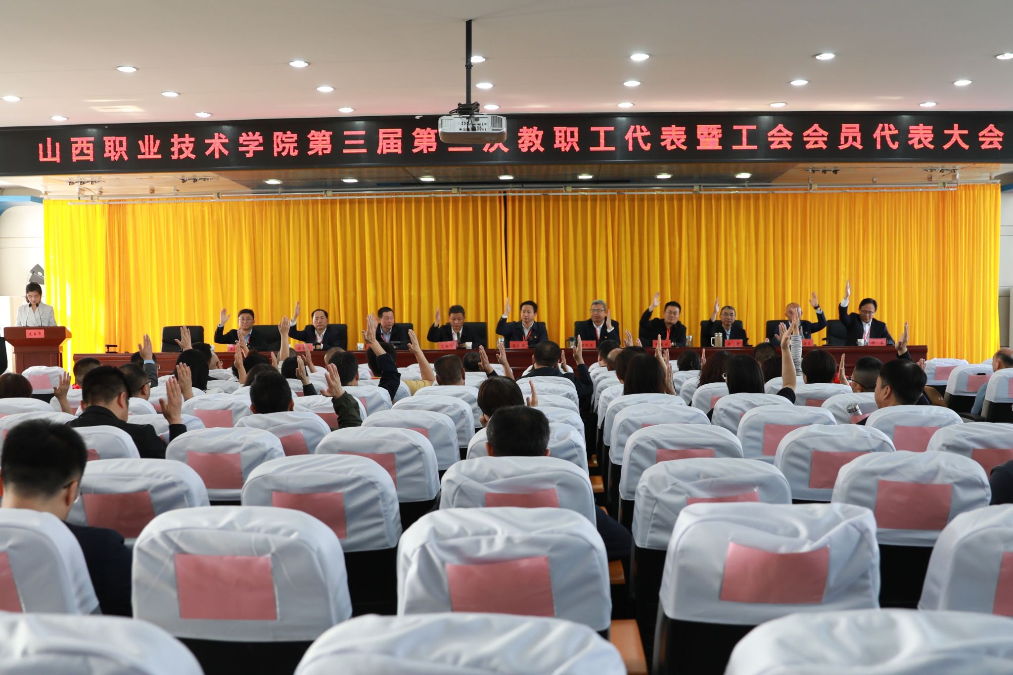 下午4时,大会举行第二次全体会议,以举手表决的方式,一致通过《学院工作报告》《学院财务工作报告及工会经费审查报告》《学院工会工作报告》《学院“三定”工作报告》《学院奖励性绩效工资分配实施方案》《新校区教职工保障性周转用房建设方案》《学院新校区景观设计方案》的决议。