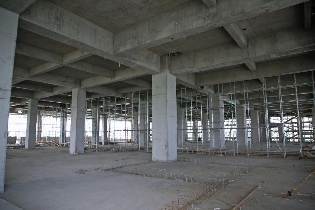 学生宿舍A区宿舍楼隔震层顶板钢筋绑扎,外架搭设。