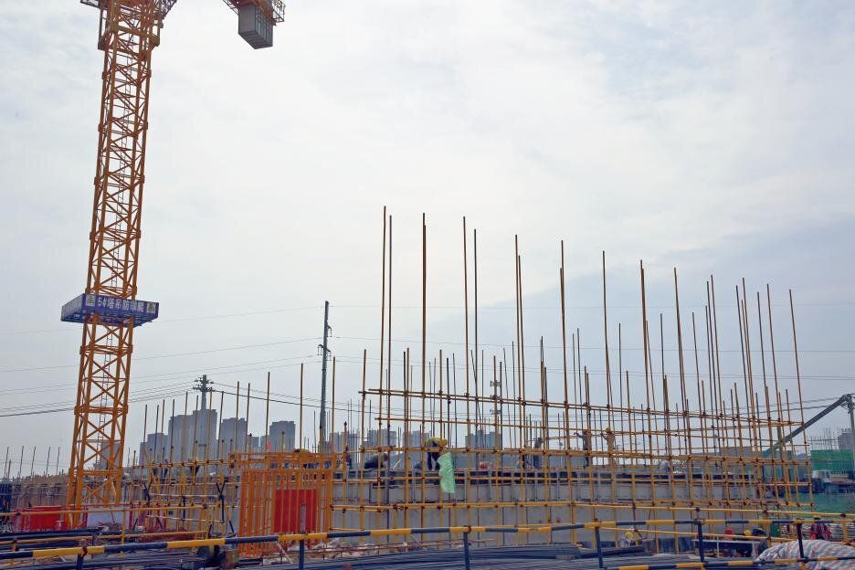 A4-2#楼四层绑扎柱子钢筋,搭设支撑架体,安装梁底模板,左、右连廊三层梁、板钢筋绑扎。