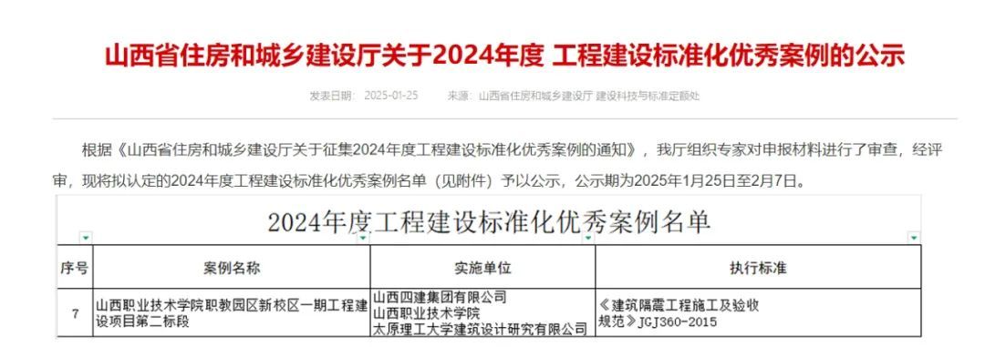 在山西省住房和城乡建设厅开展2024年度工程建设标准化优秀案例征集工作中,我公司参与报送的《万象城awc官网登录入口职教园区新校区一期工程建设项目第二标段》成功入选2024年度工程建设标准化优秀案例。