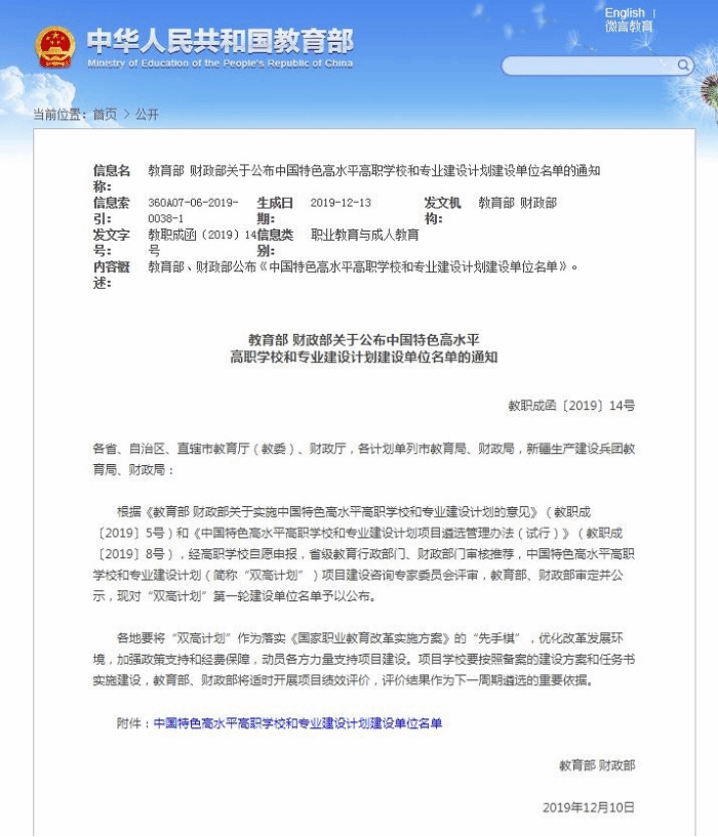 2019年12月10日,教育部、财政部发布了《教育部财政部关于公布中国特色高水平高职学校和专业建设计划建设单位名单的通知》(教职成函〔2019〕14号),公布了“中国特色高水平高职学校和专业建设计划”(简称“双高计划”)第一轮建设单位名单,万象城官网“大数据技术与应用”专业群成功入选“高水平专业群建设单位”。