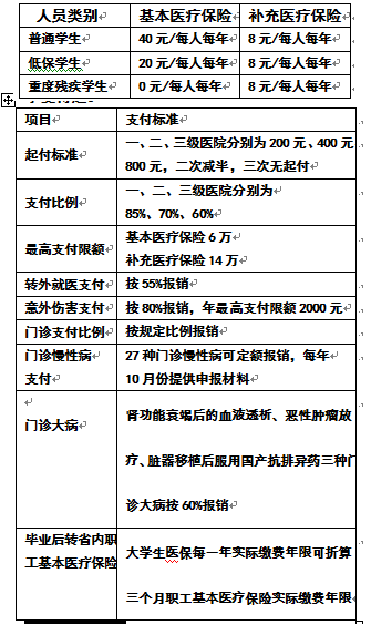 一、门诊就医: 参保学生普通门诊看病实行门诊统筹,要携带【太原市大学生基本医疗保险诊疗手册】,首先到山西大学医院门诊部就医,所发生的医疗费用,个人负担20%,其余80%费用从统筹账户支付。