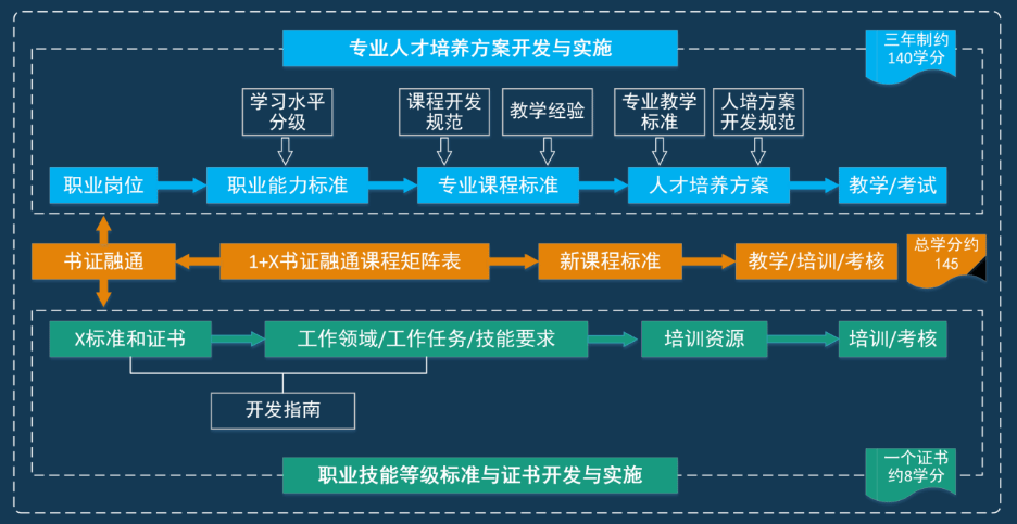 开展1+X证书制度试点,探索书证融通改革,遵循标准对应、内容融合、教学统筹、评价同步、成果互换的原则进行相互衔接和融通。所谓标准对应,是指职业技能等级标准与各个层次职业教育的专业教学标准相互对应;所谓内容融合,是指X证书的培训内容与学历教育人才培养方案的课程内容相互融合;所谓教学统筹,是指X证书培训过程与学历教育的教学过程统筹组织与实施;所谓评价同步,是指职业技能考核与学历教育专业课程考试统筹安排,同步考试与评价;所谓成果互换,是指学历证书与职业技能等级证书体现的学习成果相互转换。