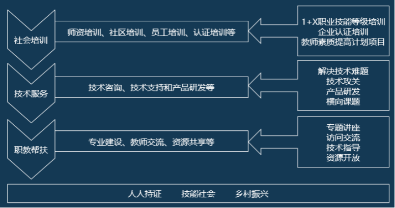 服务山西省人人持证、技能社会、乡村振兴战略,整合优质资源,构建包含职教帮扶、社会培训和技术服务的全方位社会培训体系。其中,职教帮扶主要包括为对口帮扶职业院校提供专业建设指导、教师交流培训和教学资源共享等帮扶工作;社会培训包括面向社会开展师资培训、社区培训、员工培训、认证培训等工作;技术服务包括为中小微企业提供技术咨询、技术支持和产品研发等服务工作。