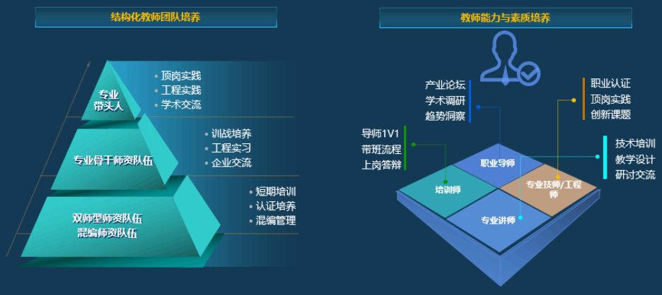 引进与培养专业(群)带头人、骨干教师,全面落实“双师”教师培养计划,通过选派教师到行业知名企业培训学习、挂职锻炼、参与技术改造与产品研发等途径,不断提高“双师”素质和专业技术能力,提高“双师”素质教师比例。