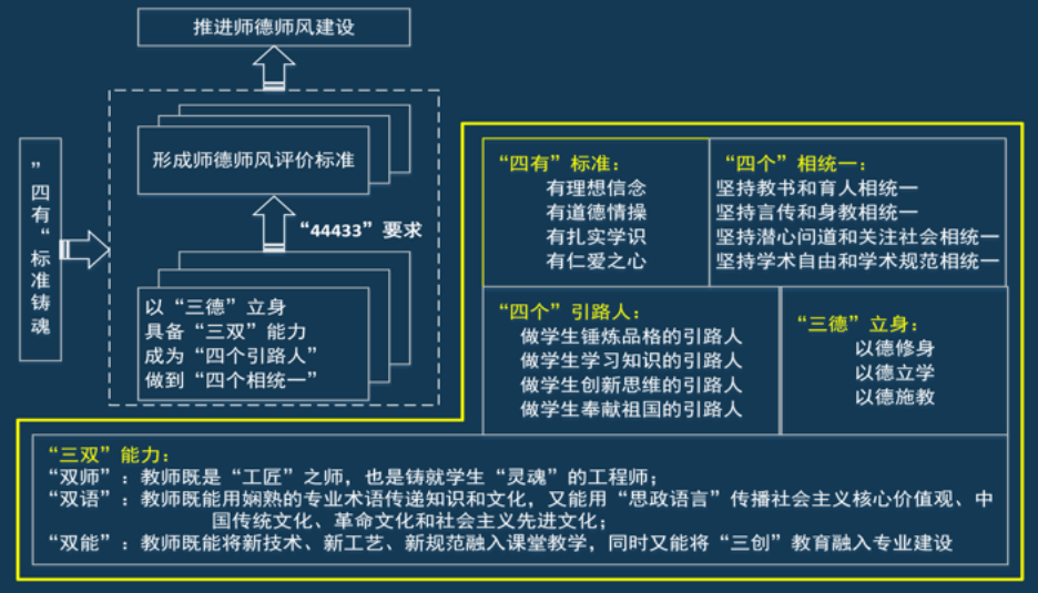 实施“44433”师德师风建设工程,构建师德师风长效机制,打造一支“名师领航、专兼结合、德能兼备”的双师型教师教学创新团队。