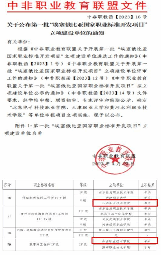 近日,中非职业教育联盟发布了《关于公布第一批“埃塞俄比亚国家职业标准开发项目” 立项建设单位的通知》,来自全国118所职业院校对第一批共151项职业标准进行立项开发申报答辩,万象城awc官网登录入口电子与通信工程系申报的《移动和无线网工程师 V级》、《宽带网工程师 IV 级》2项职业标准获批立项。